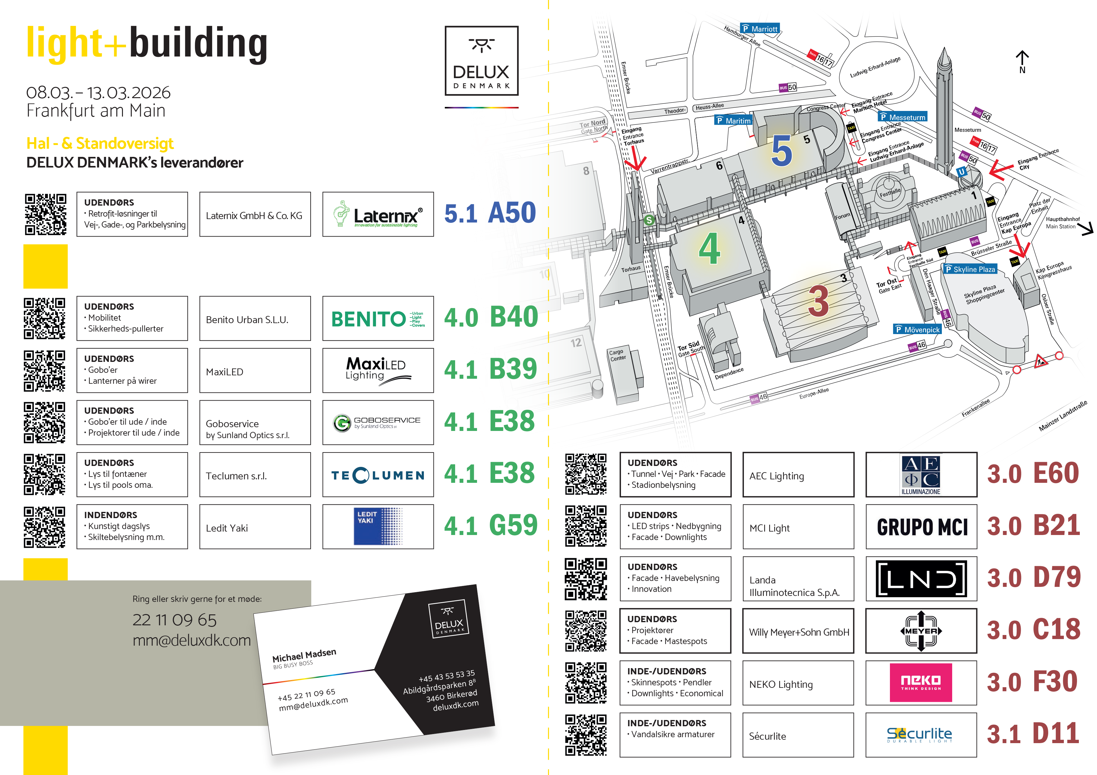Nedenstående kort er en oversigt over vores leverandørers hal-, samt stand-placeringer. Book individuelle møder med os fra den 8. - 11. marts, hvor vi befinder os på messen.